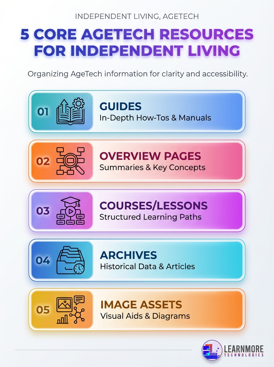 Five core AgeTech resources for independent living are visualized for quick reference. This infographic highlights tools and services that support seniors’ autonomy and safety.